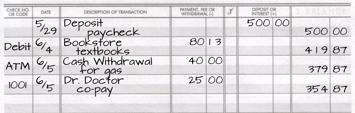 The more traditional two-line version differs from my method by using the withdrawal and deposit columns and putting the remaining balance on the second line of the balance column, leaving a line between each amount.